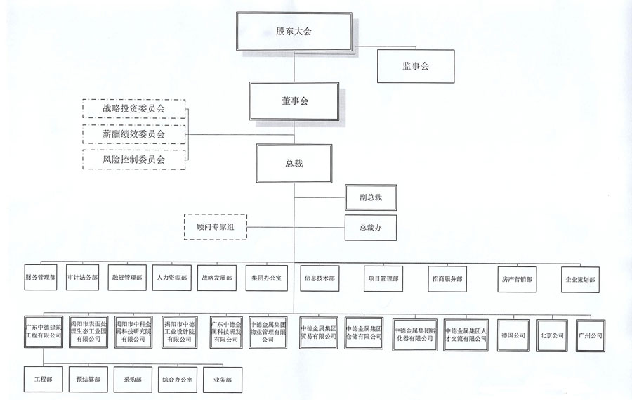 中德金屬集團按“三會一層”的管理思想,組建了職能完善、結(jié)構(gòu)清晰的組織架構(gòu)。在經(jīng)營層面,以總裁為核心,成立了集團辦公室、戰(zhàn)略發(fā)展部、人力資源部、融資管理部、審計法務(wù)部、財務(wù)管理部、信息技術(shù)部、項目管理部、招商服務(wù)部、房產(chǎn)營銷部、企業(yè)策劃部等十一個核心職能部門。同時,下轄十三家子公司。