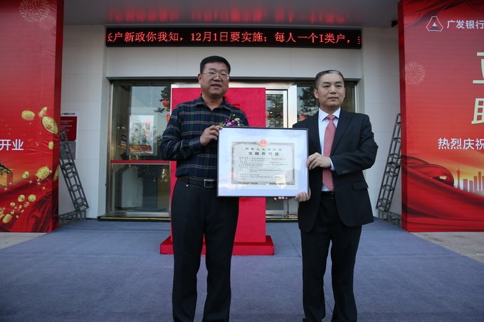 儀式上,副市長(zhǎng)劉端雄及廣發(fā)銀行總行副行長(zhǎng)宗樂(lè)新等共同為廣發(fā)銀行揭陽(yáng)中德支行揭牌。揭陽(yáng)銀監(jiān)分局局長(zhǎng)王學(xué)臣向中德支行行長(zhǎng)陳凱鴻授支行《金融許可證》。