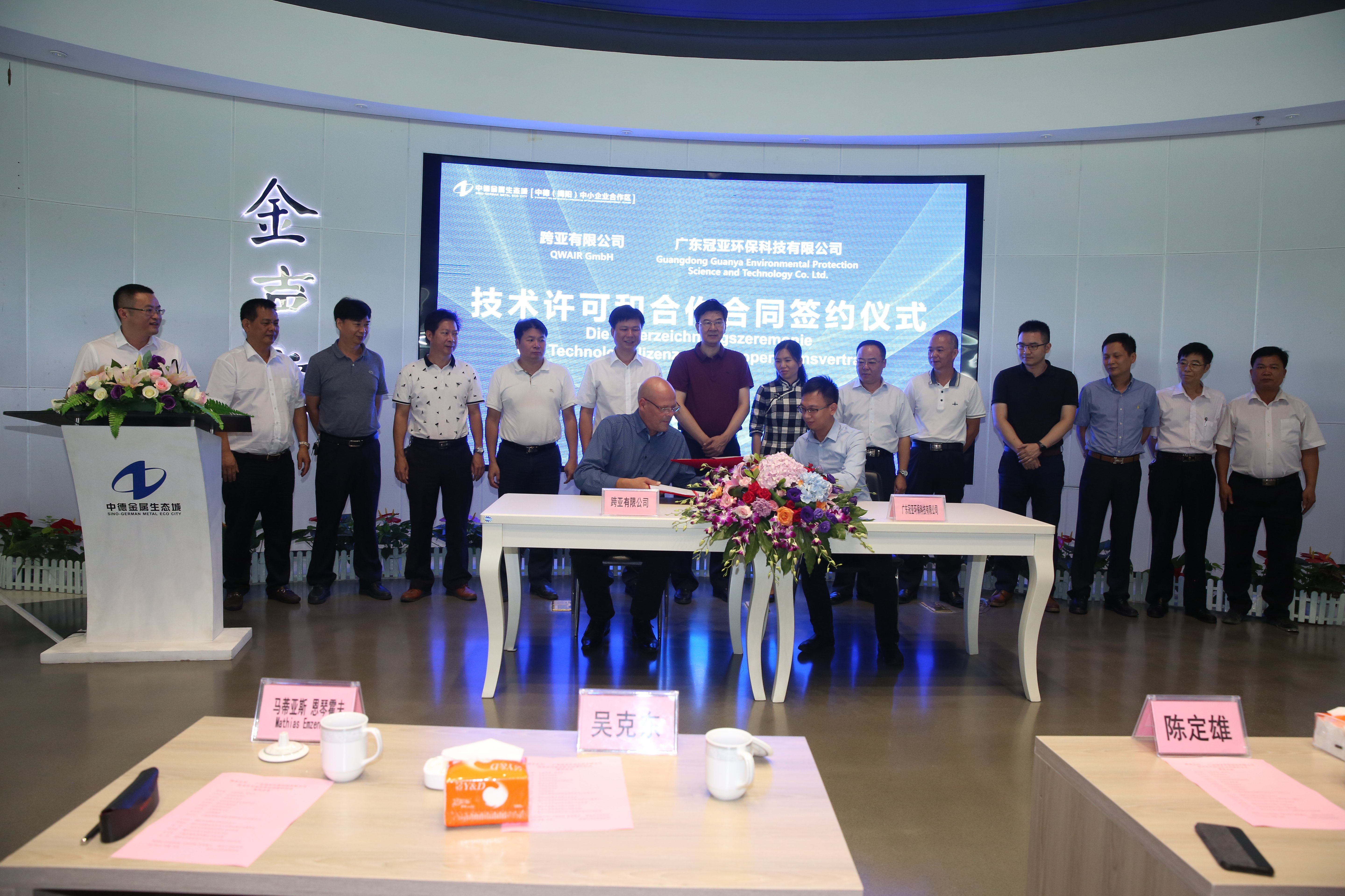 2017年8月24日,廣東冠亞環(huán)?萍加邢薰九c德國跨亞有限公司在中德金屬生態(tài)城四大中心簽署中德WaterWin水處理技術(shù)許可與合作合同,雙方將通過跨亞污水處理技術(shù)的推廣應(yīng)用,共同開發(fā)中國的水處理市場。揭陽市委常委、常務(wù)副市長陳定雄代表揭陽市委市政府出席簽約儀式并發(fā)表講話。