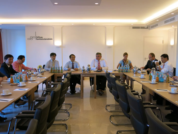 揭陽(yáng)市經(jīng)貿(mào)代表團(tuán)與德國(guó)家族企業(yè)基金會(huì)執(zhí)行主席施耐德(右四)、德國(guó)金屬企業(yè)聯(lián)合會(huì)負(fù)責(zé)人哈德勒(右三)座談
