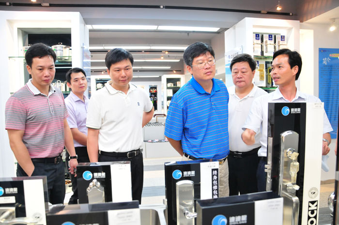 省經(jīng)信委節(jié)能處處長謝時超(右三)帶領(lǐng)調(diào)研組參觀聯(lián)合會金屬制品展廳