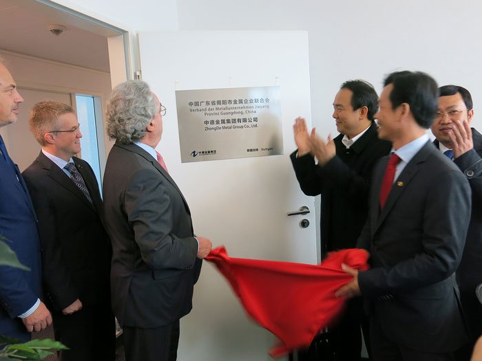 斯泰格爾先生、德國(guó)聯(lián)邦雇主協(xié)會(huì)原會(huì)長(zhǎng)迪特•洪德博士、德國(guó)西南金屬聯(lián)合會(huì)和巴登-符騰堡州雇主協(xié)會(huì)聯(lián)合主席迪克先生還與揭陽(yáng)經(jīng)貿(mào)代表團(tuán)成員一同出席中德金屬集團(tuán)德國(guó)子公司總部的揭牌儀式。