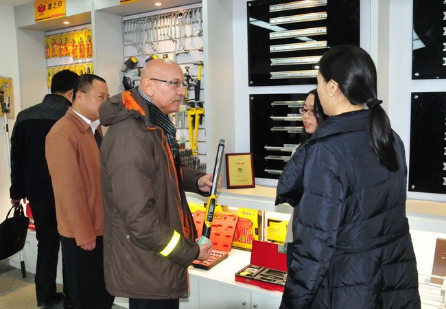 施泰格參觀金屬制品展廳的推介產品,聽取揭陽先進企業(yè)的發(fā)展情況介紹