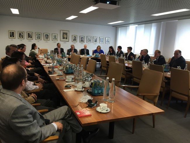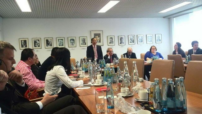 斯泰格爾基金會(huì)主席斯泰格爾先生和德國聯(lián)邦雇主協(xié)會(huì)原會(huì)長迪特•洪德博士應(yīng)邀出席。中德金屬集團(tuán)有限公司副總裁白致東帶代表團(tuán)一行8人專程與會(huì)。來自高檔環(huán)保電動(dòng)車、醫(yī)療器械以及電鍍化學(xué)等行業(yè)的近30名中德相關(guān)協(xié)會(huì)代表及企業(yè)家到場,推介會(huì)氣氛熱烈。