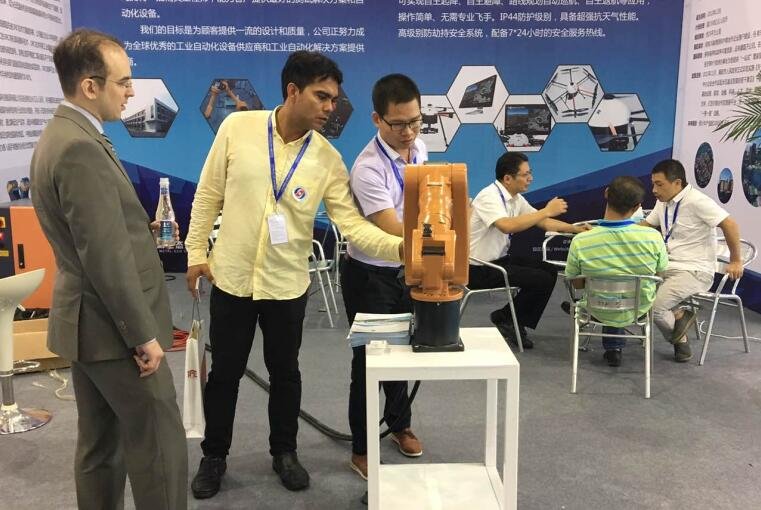 加德偉公司的智能機(jī)械臂引起境外采購(gòu)商的注意。圖為公司參展負(fù)責(zé)人現(xiàn)場(chǎng)展示產(chǎn)品功能